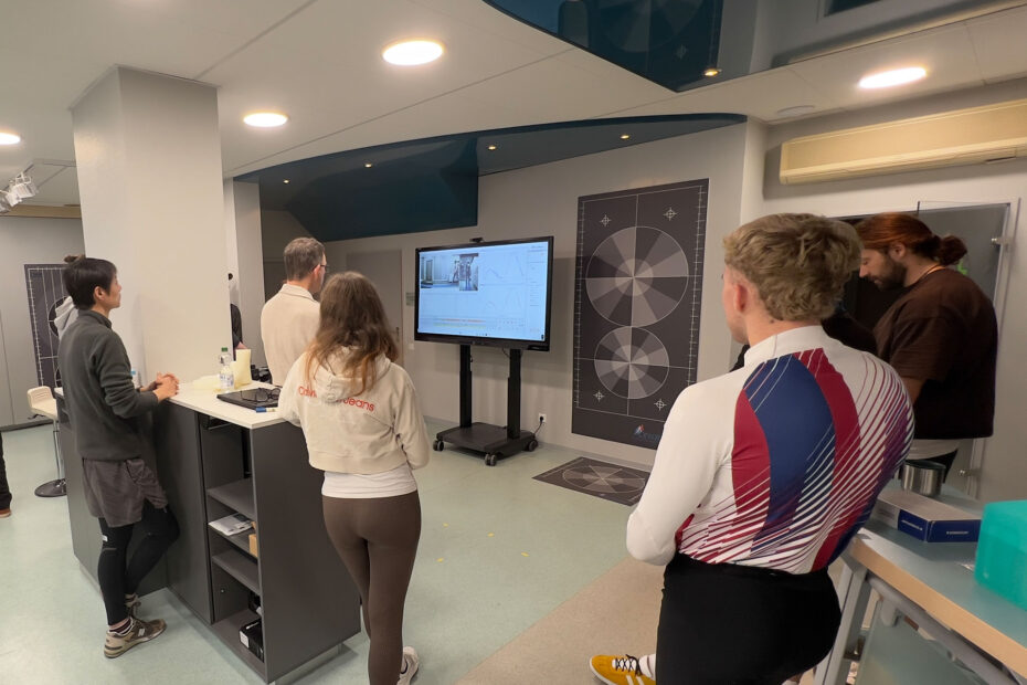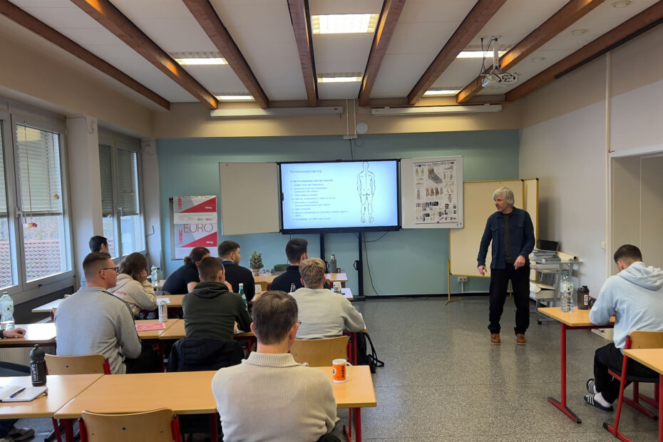 Im Analyselabor der Bundesfachschule starteten die Teilnehmenden mit einer kompakten Einweisung in Setup und Standards: Kamerapositionen, Beleuchtung, Bildausschnitt, Kalibrierung sowie Anforderungen an Kleidung und Schuhwerk. Anschließend wurden Marker an definierten anatomischen Landmarken platziert, um relevante Bezugspunkte sicher zu identifizieren und die spätere Auswertung reproduzierbar zu machen. Dieser Schritt wurde bewusst praxisnah durchgeführt, damit auch typische Fehlerquellen sichtbar werden, etwa durch ungenaue Markerplatzierung, Perspektivfehler, Faltenwurf oder Reflexionen.
